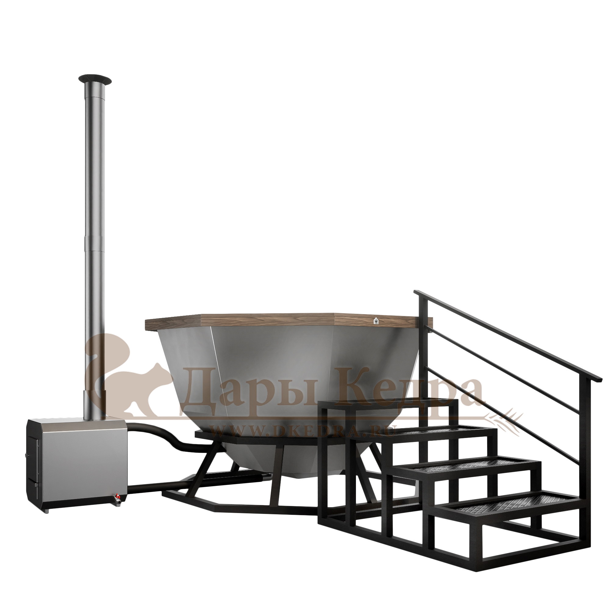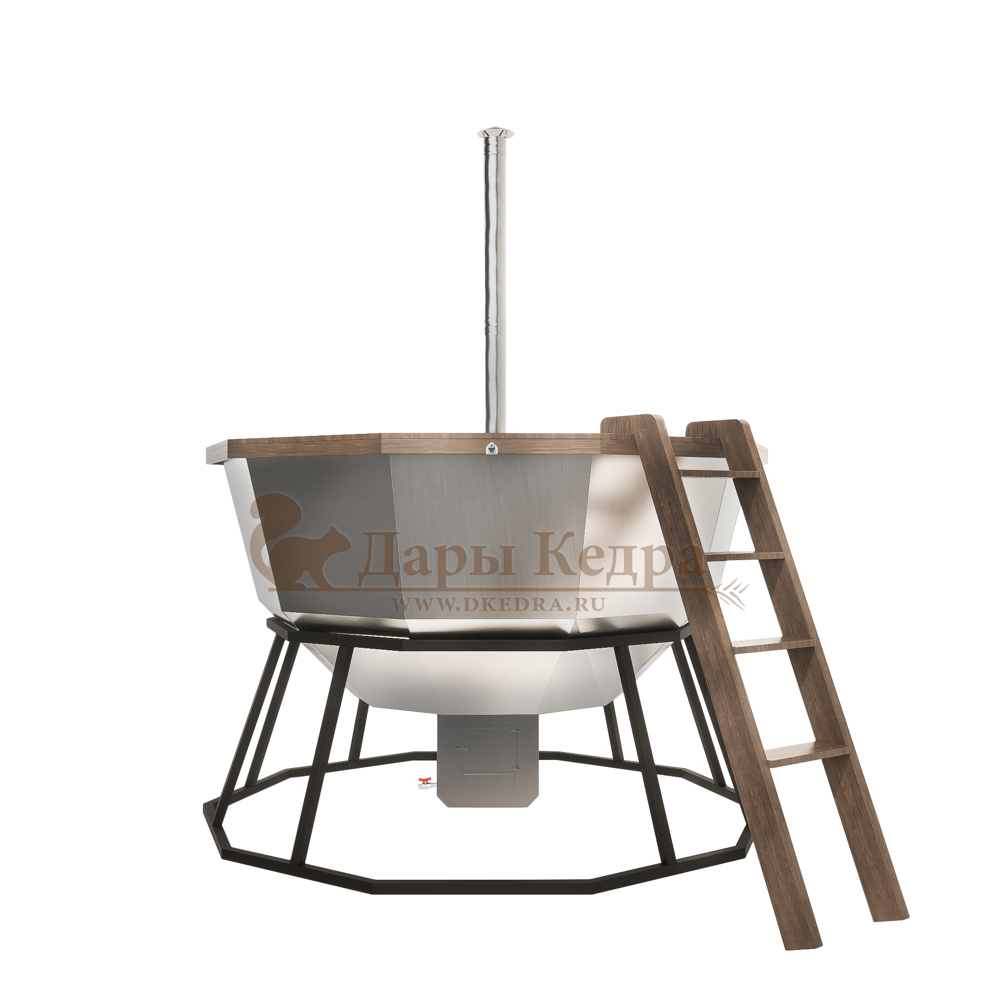 Банный чан из нержавеющей стали Ø-2000 на подставке с приварной печью с водяной рубашкой Банный чан с приварной печью печкой изготовлен из пищевой стали. Представляет собой большую ёмкость в виде чаши, при нагревании которой можно париться на свежем воздухе. Банный чан установлен на металлическую подставку и оснащен приварной печью с водяной рубашкой. Благодаря циркулирующей внутри печи воде чан быстрее нагревается и медленнее остывает. В комплект такой модели входит трёхметровый разборный дымоход. Чан оборудован кедровым бортом, скамейками, подспинниками, трапом для ног и приставной лестницей.